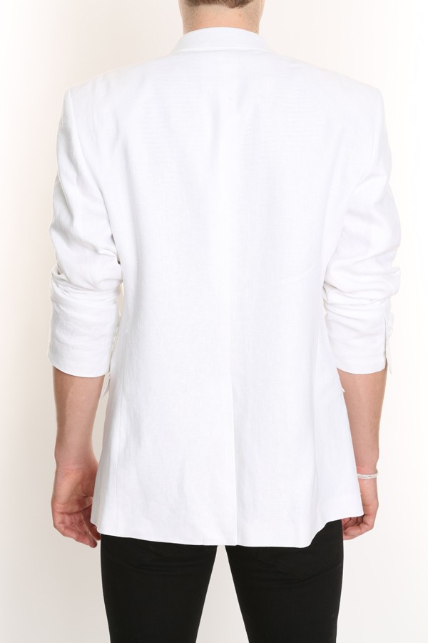 Single vented, notched lapels. Flap pockets. Tonal stitching. Fully lined. Linen. Dry clean.