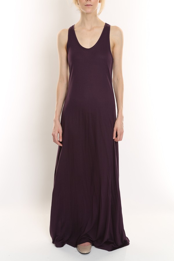 Racer back maxi dress. Pull over style. Loose fitting. Straight skirt falls to floor. Viscose.